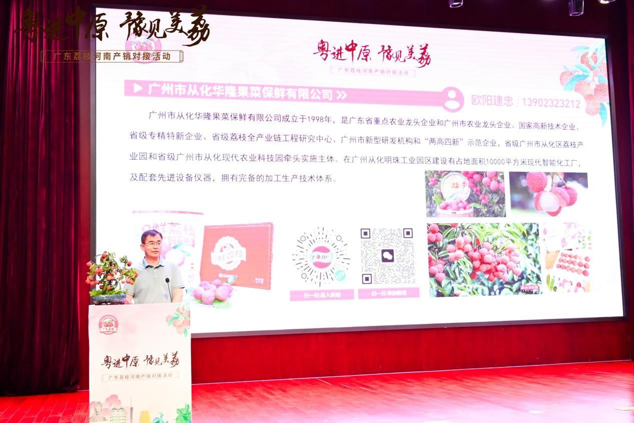 广州市从化华隆果菜保鲜有限公司董事长欧阳建忠推介广州荔枝品种和优势。