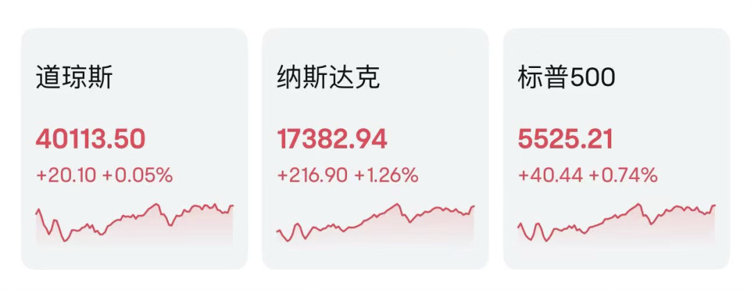 美东时间周五,美股三大指数集体收涨。截至收盘,标普500指数涨0.74%,报5525.21点;纳指涨1.26%,报17382.94点;道指微涨0.05%,报40113.5点。本周标普500指数的累计涨幅为4.59%,纳指则达到6.73%,道指累计上涨2.48%。