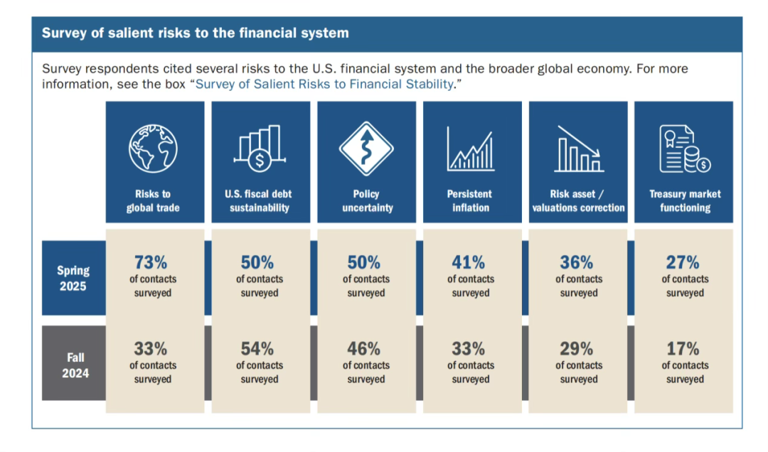 美联储最新发布半年度金融稳定报告。这也是特朗普重返白宫后,美联储首次发布金融稳定报告。报告显示,全球贸易风险、总体政策不确定性以及美国债务的可持续性高居美国金融体系潜在风险的榜首,其中有高达73%的受访者将“全球贸易风险”列为首要担忧。